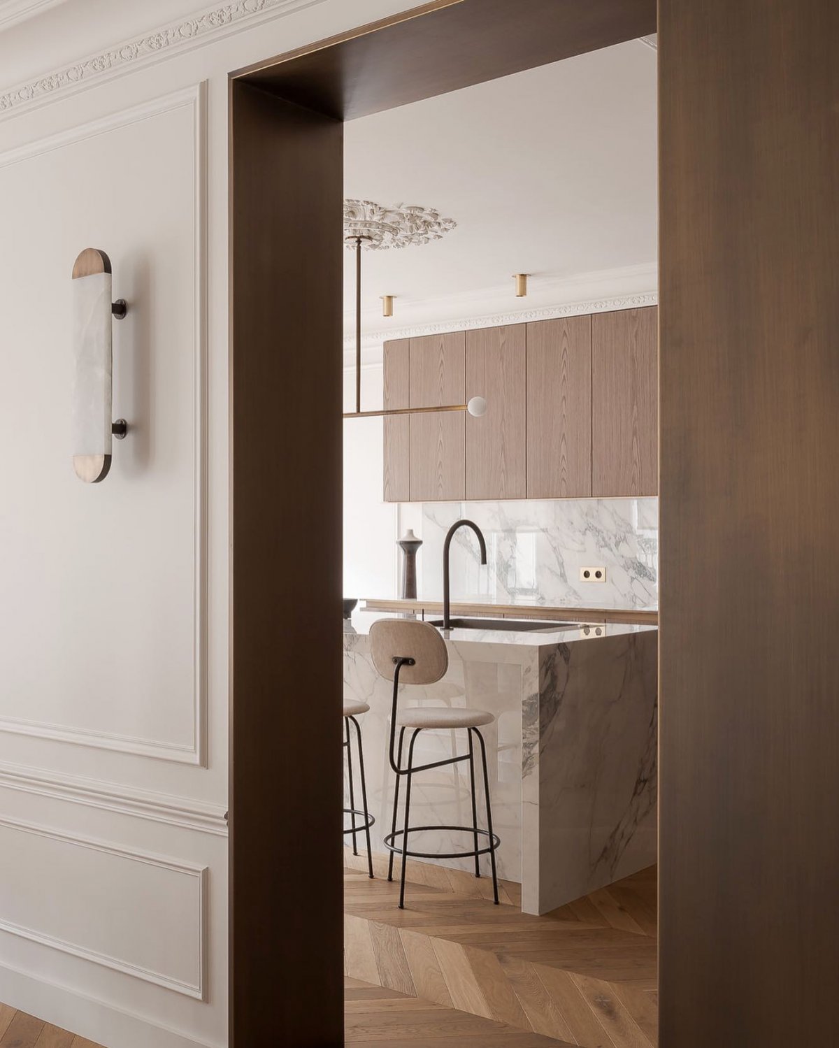 这间110平方米的公寓坐落在Haussmann建筑的五层,它的历史可以追溯到1870年,室内空间以一种完全不同的方式组织:厨房位于公寓后部;私人区域非常小,主卧室没有浴室,面朝街道,紧挨着客厅。没有原创的造型,也没有镶木地板。设计师Millory决定不保留任何窗户和地板,重新布局。Millory打开了空间,让他们沐浴在自然光中;他创造了一个更加流动的生活空间;他只在夜间布置了两间卧室,每一间都带有私人浴室。 Post navigation 上一篇 : 示觉设计·130 ㎡ 现代简约大平层设计 下一篇 : 示觉设计·200㎡-300㎡ 大宅设计·复古小清新风格合集